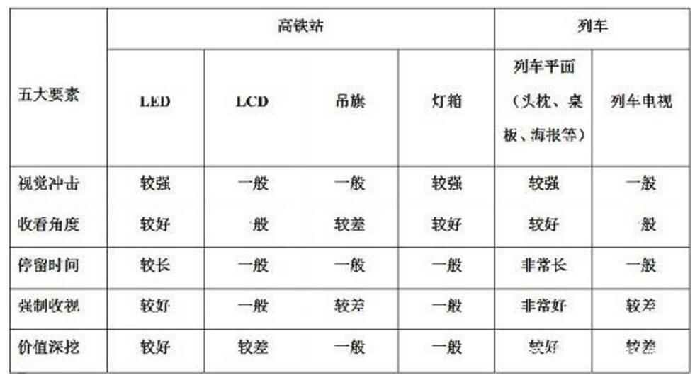 高鐵廣告媒體傳播的節點特性明顯,為社會化價值觀傳播提供了契機?;丶?、探親、學流、旅游等出行節點為企業在階段行品牌傳播上創造了社會化價值傳播內容。高鐵站內媒介優劣勢分析高鐵LCD媒體:媒體位置較散,畫面小,品質低,關注度較低;高鐵吊旗媒體:媒體位置過高,超出正常的視覺范圍,光線暗,導致到達率較低;列車電視媒體:媒體點位少,覆蓋范圍有限;廣告時段一小時一次,品牌曝光率低;列車雜志媒體:受旅客自主取閱影響,5個座位一份,廣告到達率低;翻閱時存在廣告抵觸心理,會直接翻過,接觸率低;漏放丟失嚴重,監測困難;高鐵LED媒體:與車次信息結合,強制觀看,廣告到達率高;站內唯一權威發布平臺,具備公信力;媒體位置較好,畫面大,視覺震撼強,關注度高。列車平面媒體:媒體資源豐富,可根據車型、線路劃分各級消費人群;位置醒目,可視效果好,沖擊力強;面對面,一對一近距離吸引,到達率高;高鐵燈箱廣告:媒體位置較多,形成點攔截;部分媒體位置醒目,干擾媒體少,到達率高;