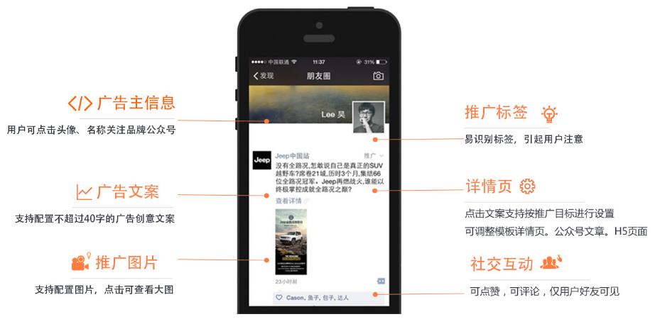 微信廣告以類似朋友的原創內容形式在朋友圈中展示的原生廣告。