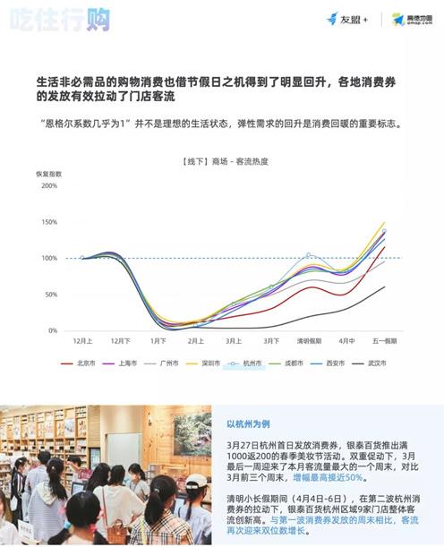 盡管不少剁手黨在疫情期間習慣線上消費,但線下商超獨特的體驗優(yōu)勢,使其依然受到青睞,加上各地發(fā)放消費券,有效拉動門店客流。杭州商場客流熱度在清明假期率先恢復至疫情前水準,除武漢外,其他城市則在4月中下旬到五一假期陸續(xù)重現(xiàn)昔日榮景。